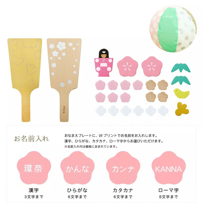赤ちゃんがはじめて迎える初正月のお祝いとして飾る「羽子板」。お正月に飾ってお祝いすることはもちろん、プーカのコンセプトである触って楽しめる知育要素を取り入れたかわいい羽子板ができました。羽子板らしい、紅白梅や縁起の良いモチーフを取り入れ、お正月らしく華やかにお飾りいただけます。