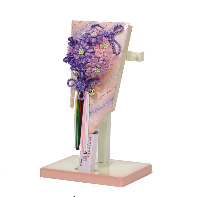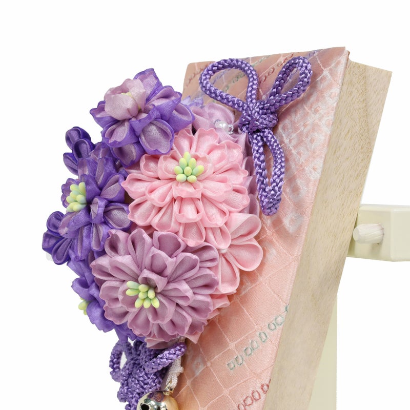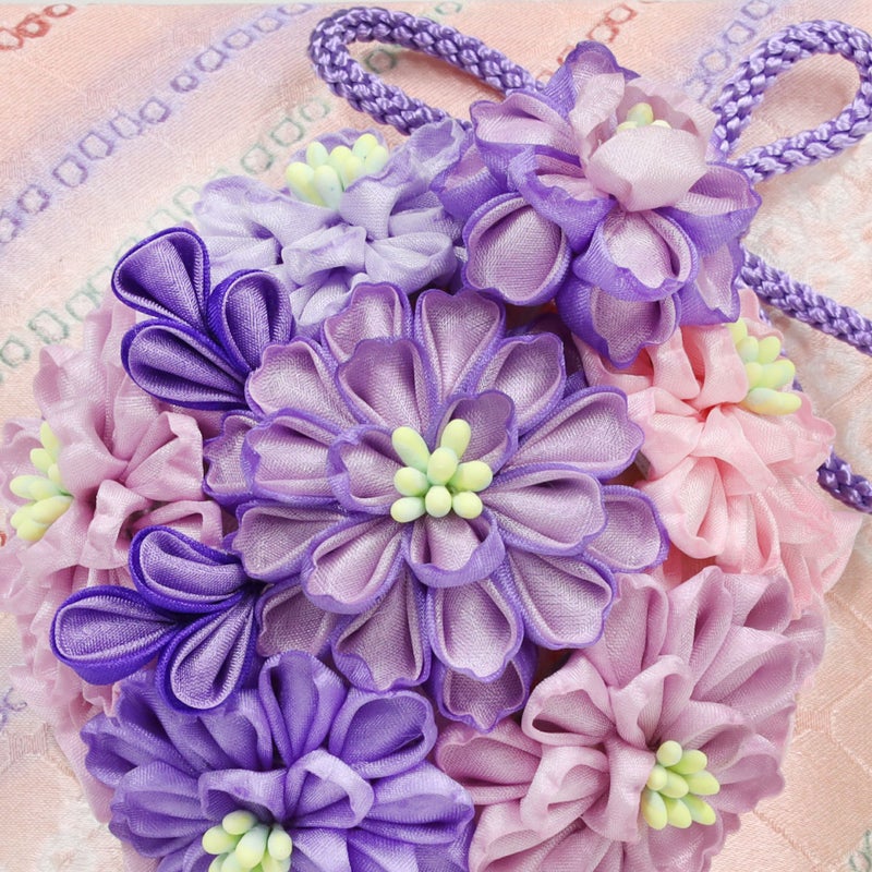 葵には「大望」や「気高い美しさ」という意味合いがあります。お花の生地は国産の羽二重シルクを使用しています。紫色は「高貴な色」や「神秘的な色」として尊ばれています。