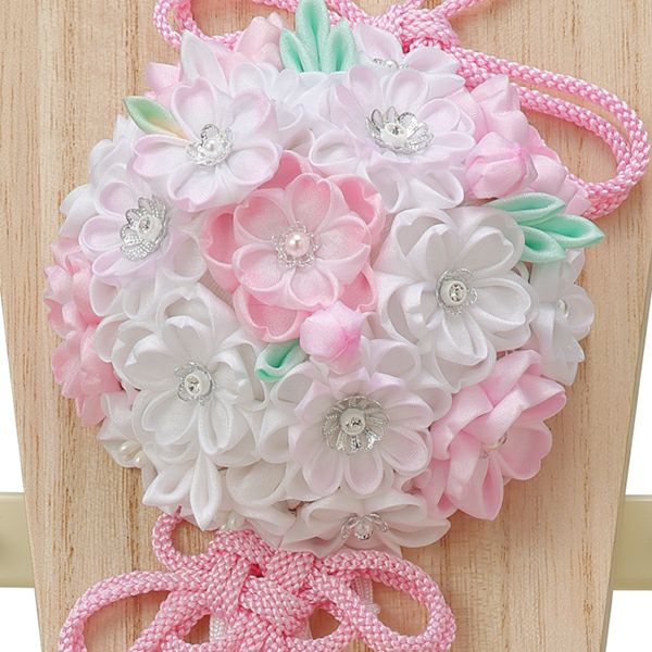 桜柄が特徴で使用している生地は、国産の羽二重シルクを使用しています。薄く繊細なシルク布で製作しているため、加工が難しく、高い技術を要します。鮮やかで上品な色合いはとても華やかで美しい羽子板になっています。白木の板がより飾り部分を豪華に魅せます。