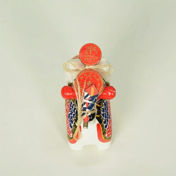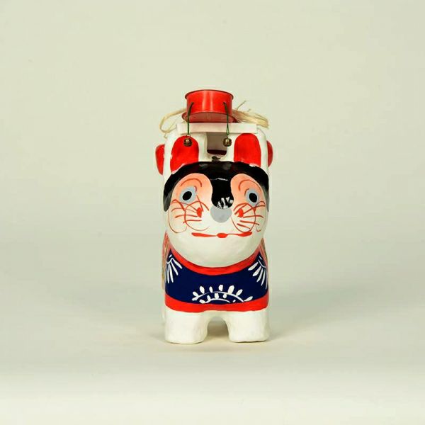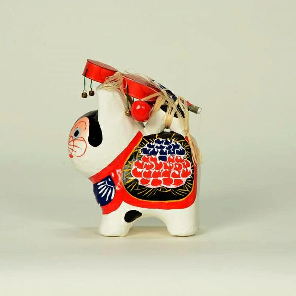 犬のかたちをした張子の人形です。犬の子どもは丈夫に育つことから、子どもが病気をせずにすくすく育つようにとの願いで、飾られるようになりました。背中に背負っているでんでん太鼓は、子どもをあやすおもちゃであるのと同時に、裏表の無い子どもに育つようにとの願いも込められています。