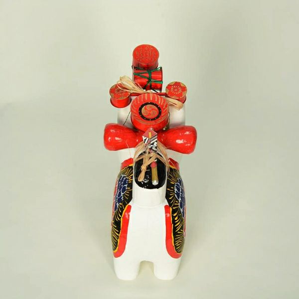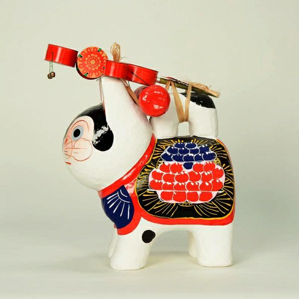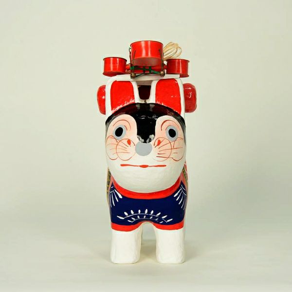 犬のかたちをした張子の人形です。犬の子どもは丈夫に育つことから、子どもが病気をせずにすくすく育つようにとの願いで、飾られるようになりました。背中に背負っているでんでん太鼓は、子どもをあやすおもちゃであるのと同時に、裏表の無い子どもに育つようにとの願いも込められています。いせ辰 作"
