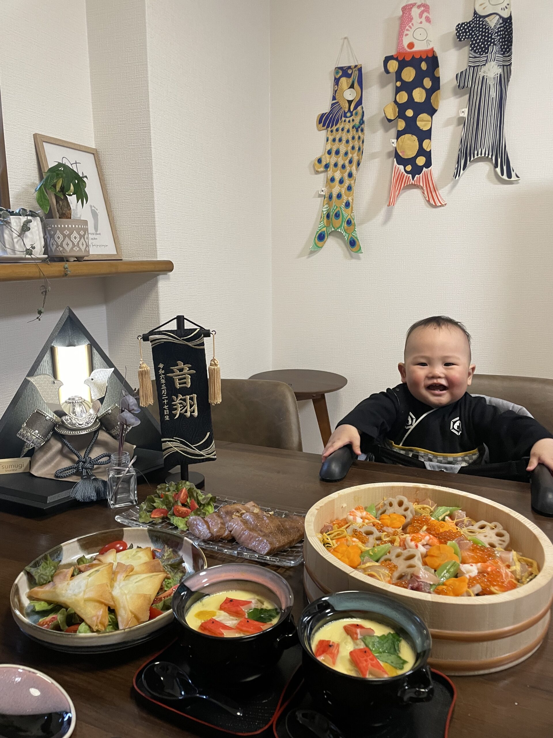 自宅で写真撮影をして、お祝いの食事を。