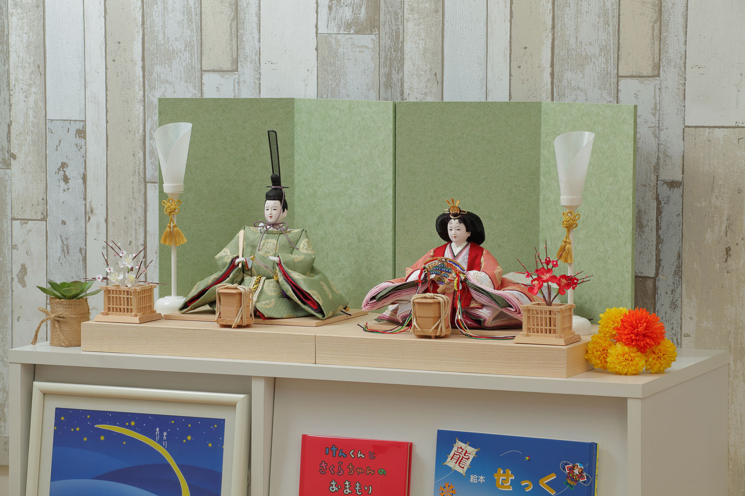 通常、ひな祭りのお殿様とお姫様の二人だけを平台の上に置き、人形の後ろに屏風を飾るタイプを平飾り(親王飾り)と呼びます。
