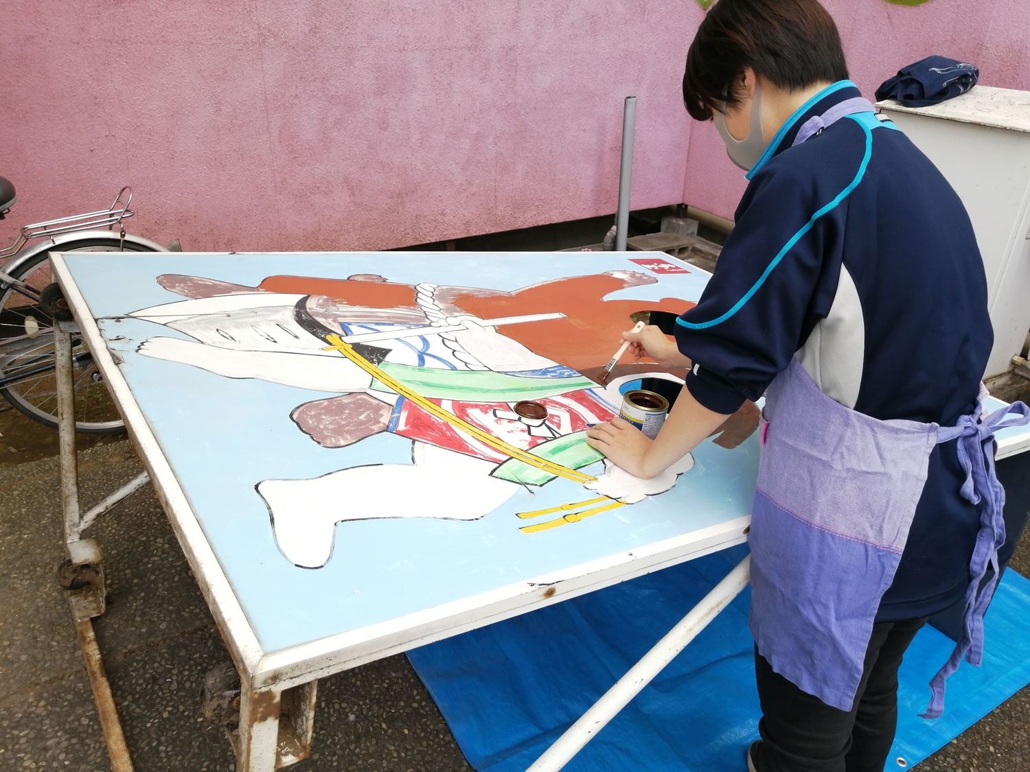 きのうは、その顔出し看板を、あるご家族が塗り直してくださいました。以前から、くたびれ気味の顔出し看板を気にしてくださっていたとのこと。