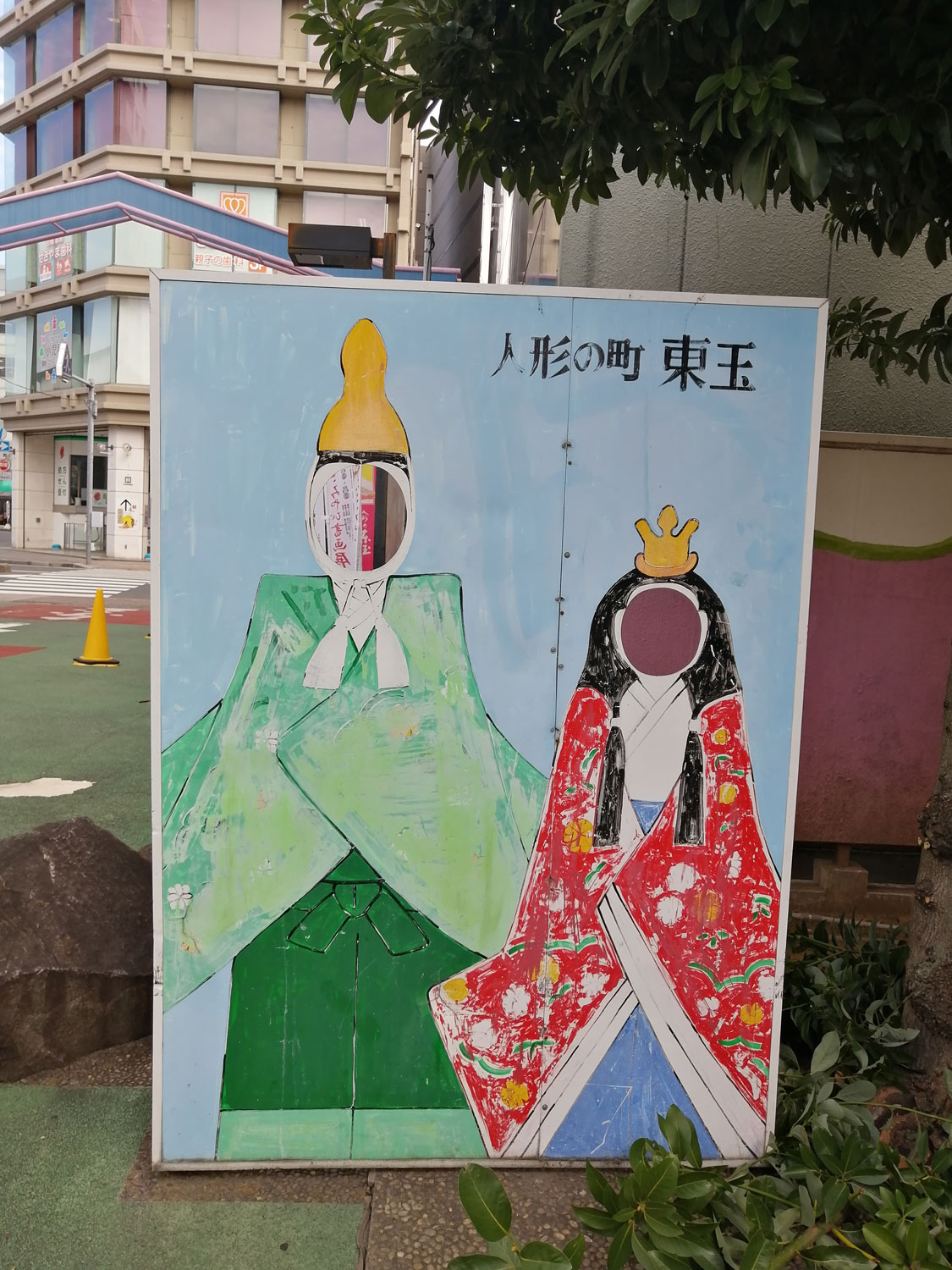 東玉の駐車場には通称「顔出し看板」と呼ばれる看板があり、くり抜かれた穴から顔を出すと、おひなさまと金太郎に変身した写真がお撮りいただけます。